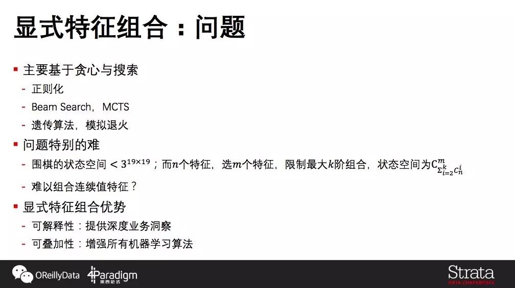 第三个介绍一下显式的组合,算法的输出会明确指定哪些特征组合起来(笛卡尔积)作为基础特征。整体思路沿着搜索与搜索优化这条路,也有一些地方使用正则化加贪心。由于显式特征组合的问题求解空间大,寻找最优特征组合是个非常难的问题。我们对比AlphaGo下围棋,19乘19的棋盘上每个点上有黑子/白子/无子三种状态,它的状态空间最大是 。考虑显式特征组合要做的事情,我们要有 个特征,限制高阶组合阶数不超过 ,从中选取 个特征,那么2到 特征的总量是,最终再从其中选取 个特征,其空间是 ,即使将不大的
