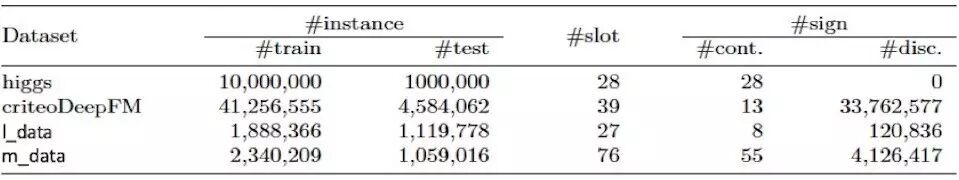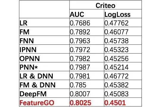 我们在4个数据及上实验了FeatureGO算法,包括两个公开的数据集(higgs、criteoDeepFM)与两个我们私有的数据集(l_data ,m_data),数据集统计信息如下: