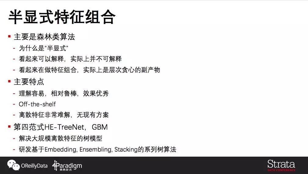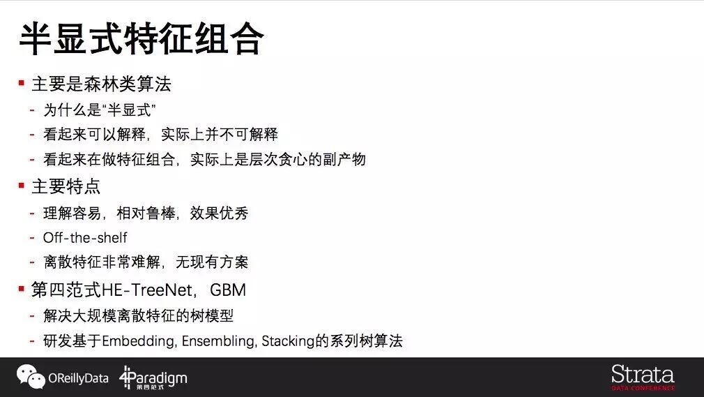 半显式特征组合第二个是半显式的组合,主要基于的是树模型。为什么说是“半显式”呢?因为大家可能认为树模可解释或者做特征组合是很自然的事情,但其实并不是:叶子节点的每一个分支并不是一种显式、直接的特征组合,而是这些特征在特定取值区间的组合。所以从结果上来说我们做到了特征组合,有一定可解释性,但是同样也没有办法直接看特征相关性或者特征之间组合关系。作为非线性模型,树模型主要的特点是容易理解,效果也是非常好的。但是类似的,它对离散的精细特征非常难处理,传统上训练一棵m个特征n个训练数据k层深t棵树的模型需要O(mntk)的时间,即使对系数特征进行优化,也很难降低特征分裂中分桶上的空间与传输消耗。在这个方面,第四范式提出了一系列算法,包括HE-TreeNet和GBM系列算法,通过Embedding,Ensemble、Stacking,General Boosting等方式让树模型可以在大规模特征的情况下可以进行特征组合。