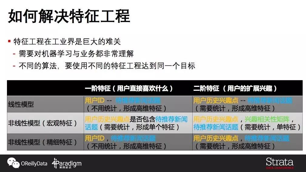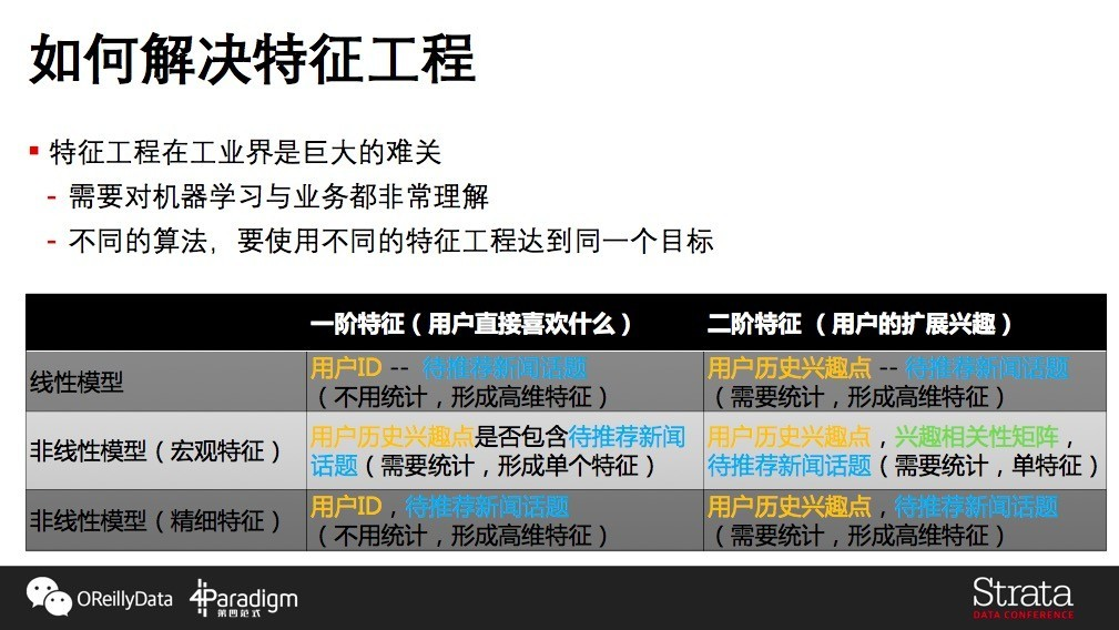 回头看,如何在之前提到的“复杂模型(非线性模型)+宏观特征”这条路添加一阶特征呢?如图左下角所示,由于是宏观特征,我们需要将不同的话题变成单个特征,一种做法是通过一阶逻辑的判断“ 本篇新闻的话题是否属于用户历史的兴趣 ”加入。这种方式下,在线上服务的时候,我们除了需要推荐实时信息之外,还需要实时维护用户历史的兴趣点,但是模型本生的更新频率就不用那么快了。毕竟,为了达到推荐时效性目标,要么特征静态、模型特别实时,要么特征实时、模型静态不变。