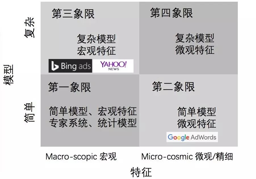 这样就把人工智能分为了四个象限。如上图,左下角是第一象限,使用宏观特征简单模型解决问题。这种模型在工业界应用非常少,因为它特征数少,模型又简单,VC维就是低的,不能解决非常复杂的问题。右下角的第二象限是简单模型加上微观特征,最有名的就是大家熟知的谷歌Adwords,用线性模型加上千亿特征做出了世界顶尖的广告点击率预估系统。左上角的第三象限是复杂模型加宏观特征,也有诸多知名公司做出了非常好的效果,例如Bing广告和Yahoo,经典的COEC+复杂模型在这个象限内是一个惯用手段。最后是第四象限,利用复杂模型加上微观特征,由于模型空间太大,如何计算以及解决过拟合都是研究的热点。
