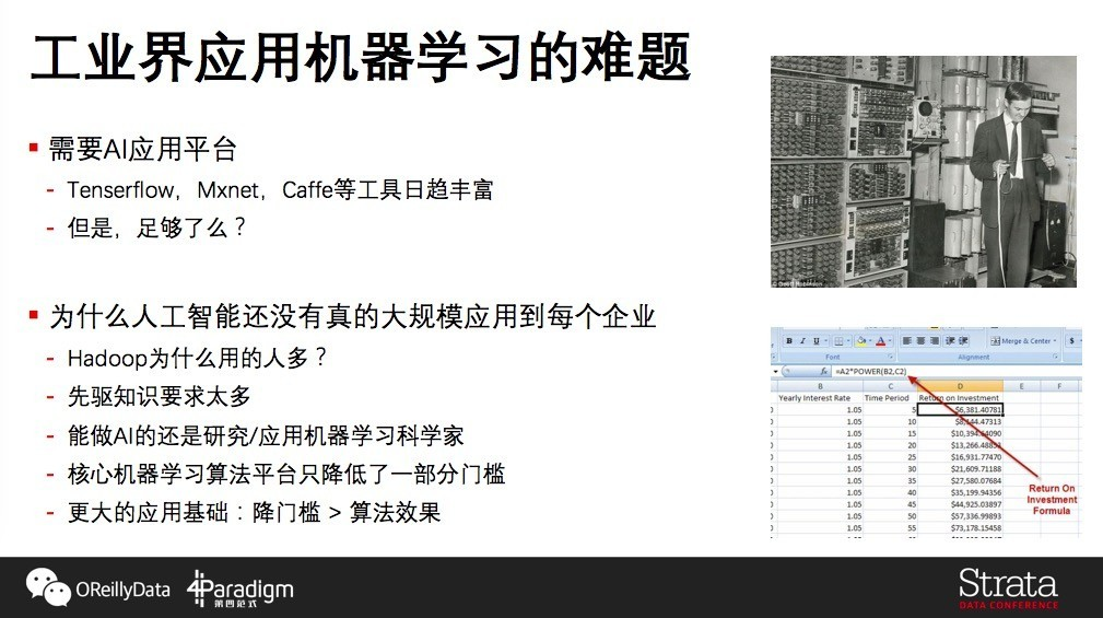 所以现在能够做AI应用的人,主要还是那些研究及应用的机器学习科学家,需要那种既懂机器学习,又了解业务,还精通系统架构的工程师。这就造成了AI的高门槛。就如同三四十年前,真正编程的人并不是现在我们这样的人,而是一群科学家们,他们通过纸带来控制程序的运行,自己不仅要编程,还得非常懂计算机体系架构。导致的结果是,根本不是每个人都能接触到这项技术,不是每个企业都能受惠于这个技术。但是现在,甚至在Excel中都可以编程,这些程序员可能完全不知道计算机的体系结构、操作系统、编译原理、数据库的概念,将全部心思花在理解与解决业务问题上,达到事半功倍的效果。