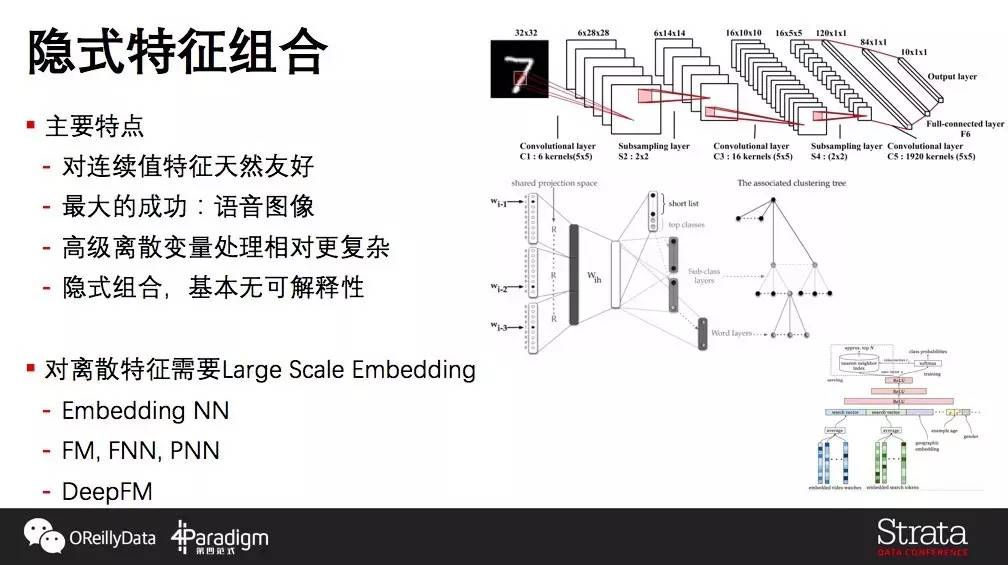 隐式特征组合隐式特征组合主要特点是对连续值特征非常友好,最成功的应用场景是语音和图像。在这些原始信号是像素或是声波的问题里面,深度学习通过神经元网络产生底层的Filter以及层次化的特征组合,获得了远超人类手工特征工程的效果。但是深度神经网络并不是万能的,在深度学习中,高维离散特征的变量处理非常复杂,同时缺乏可解释性,过于黑盒化也是神经网络大家关注的焦点。这样会导致深度学习出来的特征组合相对难用到其他算法之上,也很难给人明确的信息反馈。