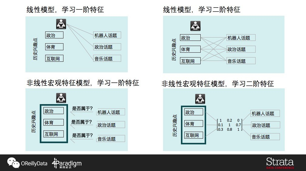 那么,如果我们要学习二阶特征呢?对于线性模型(如右上角所示),我们也需要用到用户的历史兴趣点,将用户的历史喜好与文章的话题进行组合(User_Topic-New_Topic),这样模型就可以学到历史上喜欢什么样话题的人还会喜欢什么样的新闻话题,达到二阶迁移的目标。对于非线性模型(如右下角所示),我们要做的将原先的 一阶逻辑 判断(可以认为是个Identity矩阵)变成一个二阶状态转移矩阵,通过历史统计得知不同话题间喜欢转换的情况,推算出一个不在用户现有兴趣点中的文章话题是不是用户喜欢的。