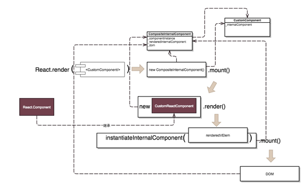 JSX 中的 <CustomComponent/> 其实并非实例化的 CustomComponent,而是其构建函数,所以它实际上是 ComponentClass,会在 CompositeInternalComponent 中将它实例化,再调用 ComponentClass.render() 得到应该渲染的 VElement,而后根据 VElement 实例化渲染结果对应的 InternalComponent 并且 mount。