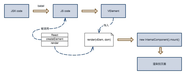 大致的流程是 babel 把 JSX 转译成含有 React.createElement 的 js 代码后,createElement 返回一个 VElement 对象,以一个树状的数据结构保存着元素的父子关系,props 等(其实在这里 VElement 就是 VirtualDOM Element 的缩写)。而后 render 函数在拿到 VElement 后先实例化一个内部的 InternalComponent,然后调用其 mount 函数得到 DOM 元素并且渲染到页面上。