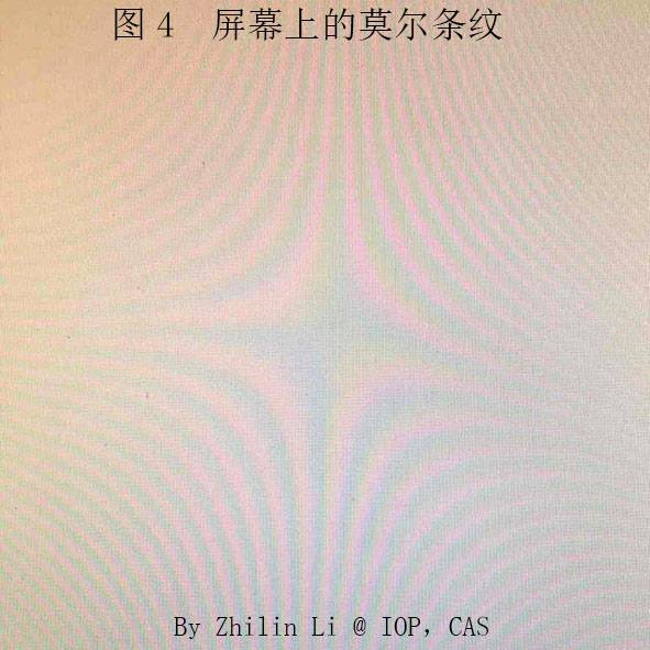 附图 4 和附图 5 可以清晰地说明这一点。例如,附图 5 中同时有与刷新率有关的纵向明暗条纹和弯曲的彩色莫尔条纹,而当调整屏幕刷新率到合适频率后,与刷新有关的条纹消失,仅留下附图 4 中纯粹的莫尔条纹。