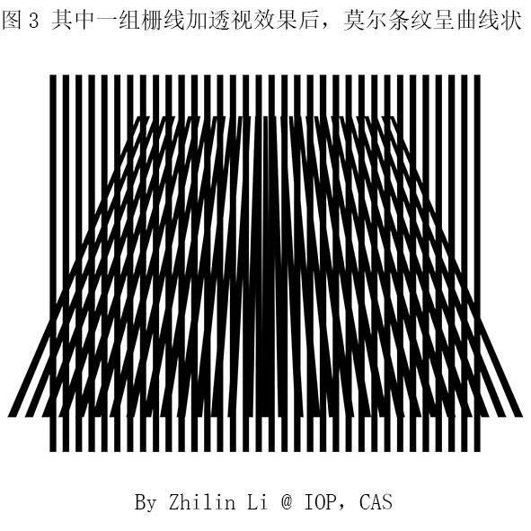 再加上角度偏离时的透视、镜头成像时的畸变,以及屏幕本身的微小形变,拍摄到的莫尔条纹同样可以有不同程度的弯弯扭扭。 其中一个加上透视效果后,条纹呈曲线状,如附图 3。