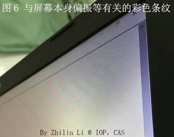 6. 其实有些屏幕本身还会有另一种条纹,大家似乎都没有提到,不过我也补充下吧。如附图 6 中的同心环彩色条纹 ,这个与以上完全无关,是屏幕本身结构导致的光学现象,与偏振有关,这里不做赘述。非磨砂的液晶屏更容易看到,尤其是侧面倾斜观察时。它的特点是关了电脑也能看到,而且肉眼看就有,与相机无关。这个容易区分。