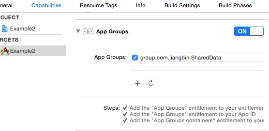 iOS8之后苹果加入了App Groups功能,应用程序之间可以通过同一个group来共享资源,app group可以通过NSUserDefaults进行小量数据的共享,如果需要共享较大的文件可以通过NSFileCoordinator、NSFilePresenter等方式。开启app groups,需要添加一个group name,app之间通过这个group共享数据: