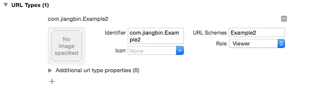 Identifier用于标示名称,为了唯一性可以采用反转域名的形式,另外我们设置URL Scheme为Example2,以及role为Viewer(Viewer表示只能读取改URL但不能修改,Editor可以对URL进行读写),这样Example2就能够接受类似"Example2:\"的URL请求了,可以在浏览器中输入"Example2:\"链接打开app。