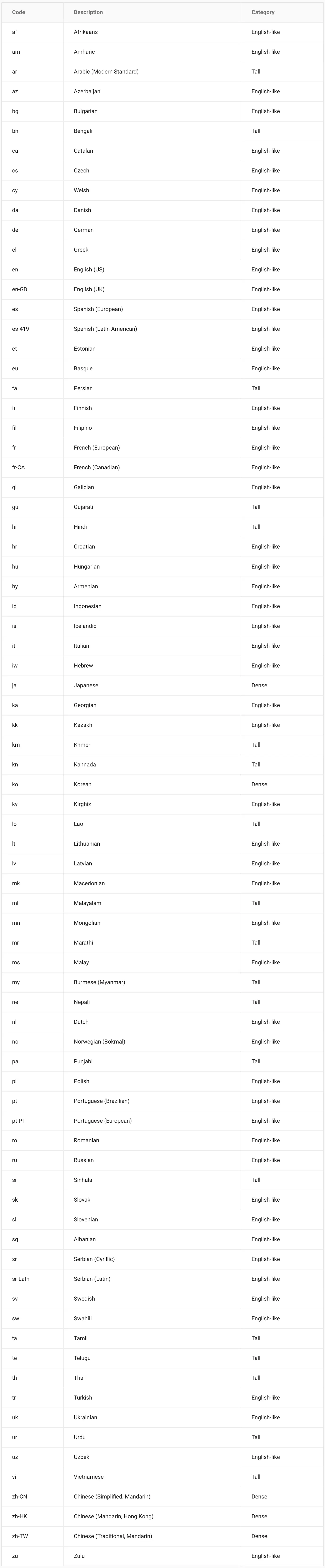 为了便于国际化,Google已将语言分为三个类别:英文和类似英文的、高长型的、密集型的。
