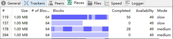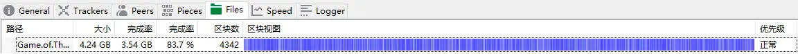在pieces一栏可以发现文件被分割成为很多份,每小份为1M大小,而我当前下载的视频为4个多G。在files栏里可以看到所有区块的下载状况。