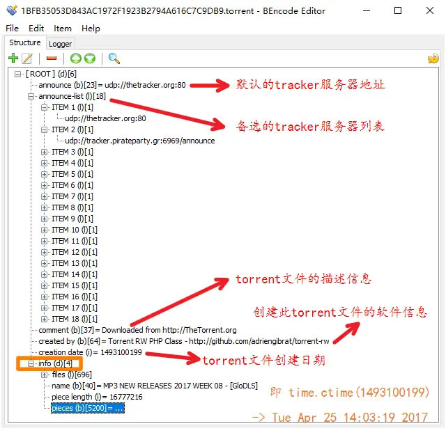 在BEncode Editor中显示如下,这个73KB的种子包含了丰富的信息,在它的tracker服务器列表中可以看到名为海盗党的希腊域名,这个种子文件也才创建不久。