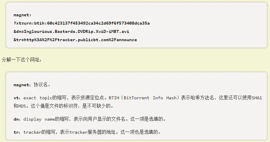 下图是一个磁力链接的分解,来自阮一峰老师的BT下载的未来,详细见wiki百科-磁力链接