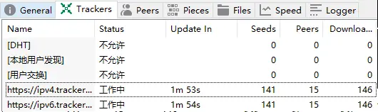 原来,该BT站点提供了一个Tracker服务器(倒数一二行),记录了所有下载者的信息或者文件分享者的信息,当我下载文件时,这个服务器会告诉我其他人的下载状态(谁拥有资源,谁下载完成了,谁正在下载),也告诉其他人我的下载状态,让我们互通有无,互相传递资源,增加下载速度,而tracker服务器充当了信息交换中心的角色。可以看到,第一行的DHT被禁用了,是为了不走外网流量,DHT非常重要,下文会讲到,暂时不管。