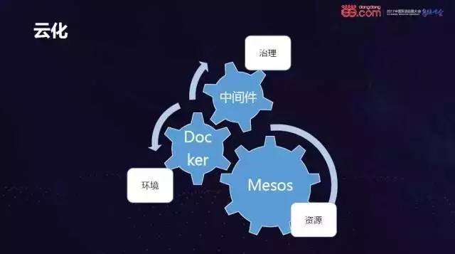第二部分:介绍当当的弹性化中间件。现阶段,无状态容器已趋于成熟,需要进一步开发和优化的是运行在容器里面的部分,即中间件。