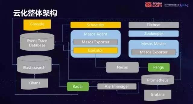 上图是更加全面的整体云化架构图。可以从运维、构建、日志和监控4个方面说明。