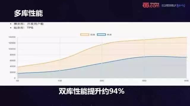 上面两个图是Sharding-JDBC的性能测试报告,在单库时,由于SQL解析带来的损耗,Sharding-JDBC比原生JDBC慢了0.02%。而将数据拆分至双库,Sharding-JDBC比原生JDBC的性能提升了94%,因此,拆分的数据库实例越多,其对性能的提升也越显著。