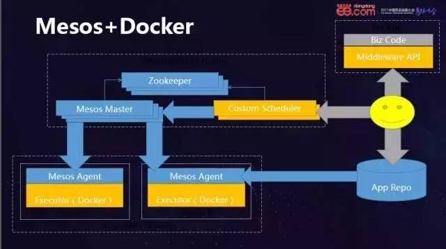 最后,一个可快速运行且高度弹性化方案的最后一块拼图,即是需要一个平台去合理分配资源以及自动分发应用。目前比较流行的是Kubernetes和Mesos两种方案。在使用的复杂度上Kubernetes要更加简洁和一站式,但Mesos所采用两级调度概念,通过其Framework定制化非常简单,因此当当选择Mesos作为资源调度系统。