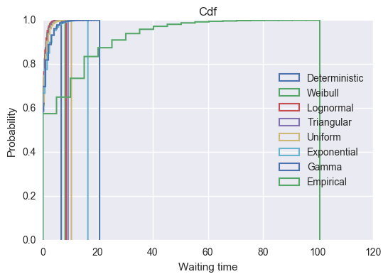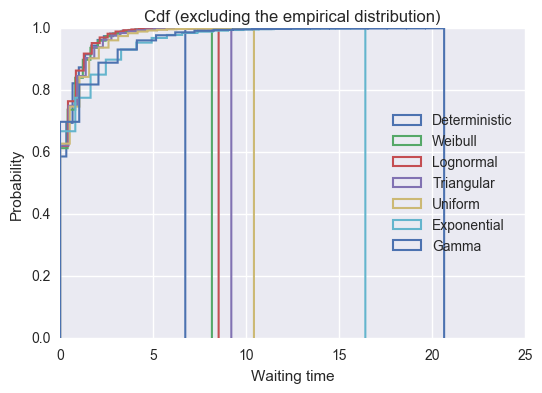 We see that the empirical distribution has by far the longest tail with some individuals having more than 80 time units spent waiting. Whilst this distribution is pretty artificial, it is fairly realistic to assume that there is a particular procedure or service that often takes no time at all but rarely does take a lot of more time. Examples of these will include healthcare operations where non routine procedures sometimes are needed.