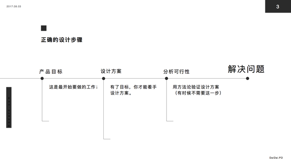 区别是什么呢?两者做法都有问题,前者没有产品目标;后者有了目标却没有去做分析。但是相比起来,后者的做法会更好。因为我们在工作中更应该注重的是产品目标,而正确的步骤是:找到产品目标后,开始着手设计方案,遇到问题,再用方法论做分析,来衡量设计方案的正确性。(这里的方法论有时候是可有可无的)