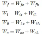需要学习的参数挺多的,同时也可以看到LSTM的输出h_t有四个输入分量加权影响,即三个门相关的 f_t i_t c_t o_t,而且其中权重W都是拼接的,所以在学习时需要分割出来,即