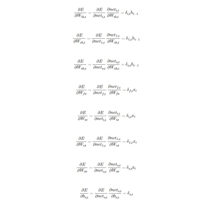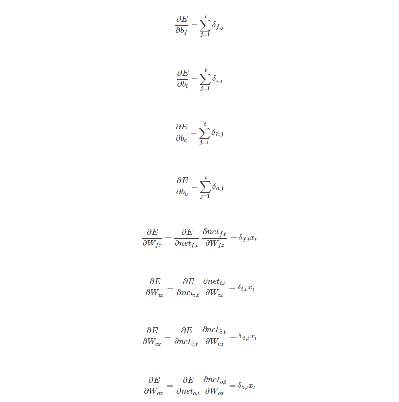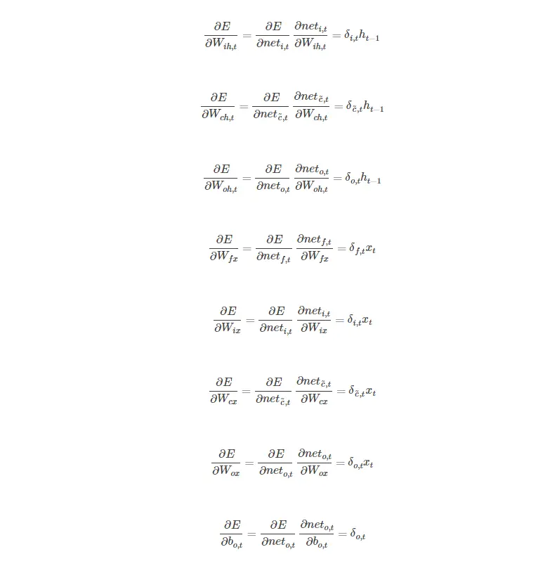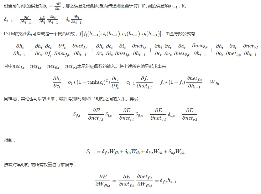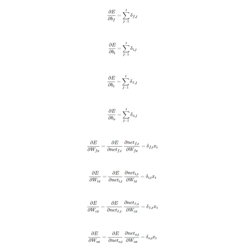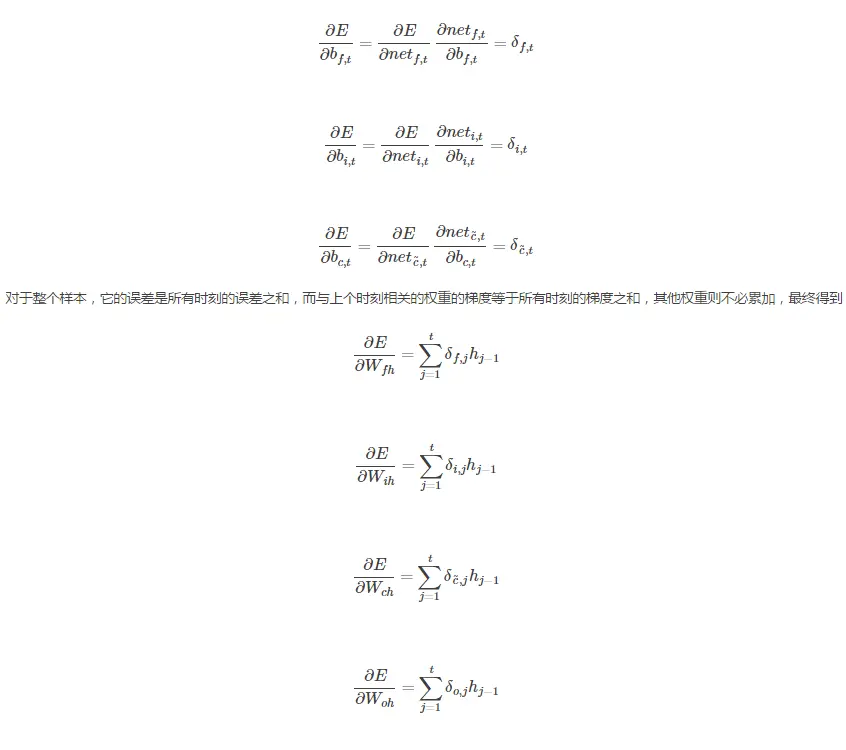 化繁为简,这里只讨论包含一个LSTM层的三层神经网络(如果有多个层则误差项除了沿时间反向传播外,还会向上一层传播),LSTM向前传播时与三个门相关的公式如下,
