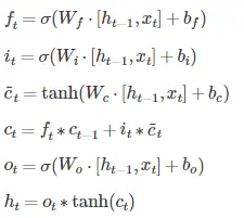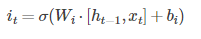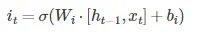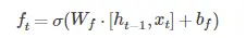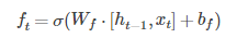 其中中括号表示两个向量相连合并,W_f是遗忘门的权重矩阵,\sigma为sigmoid函数,b_f为遗忘门的偏置项。设输入层维度为d_x,隐藏层维度为d_h,上面的状态维度为d_c,则W_f的维度为d_c\times(d_h+d_x)。