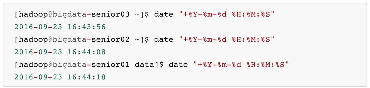 可以看到 bigdata-senior01 上的时间已经实现自动同步了。