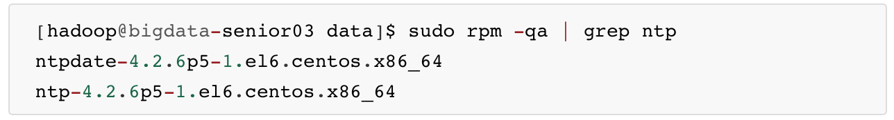 显示已经安装过了ntp程序,其中ntpdate-4.2.6p5-1.el6.centos.x86_64 是用来和某台服务器进行同步的,ntp-4.2.6p5-1.el6.centos.x86_64 是用来提供时间同步服务的。