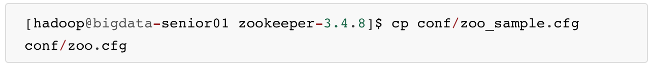 拷贝 conf 下的 zoo_sample.cfg 副本,改名为 zoo.cfg。zoo.cfg 是 zookeeper 的配置文件: