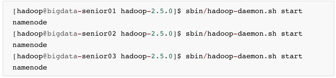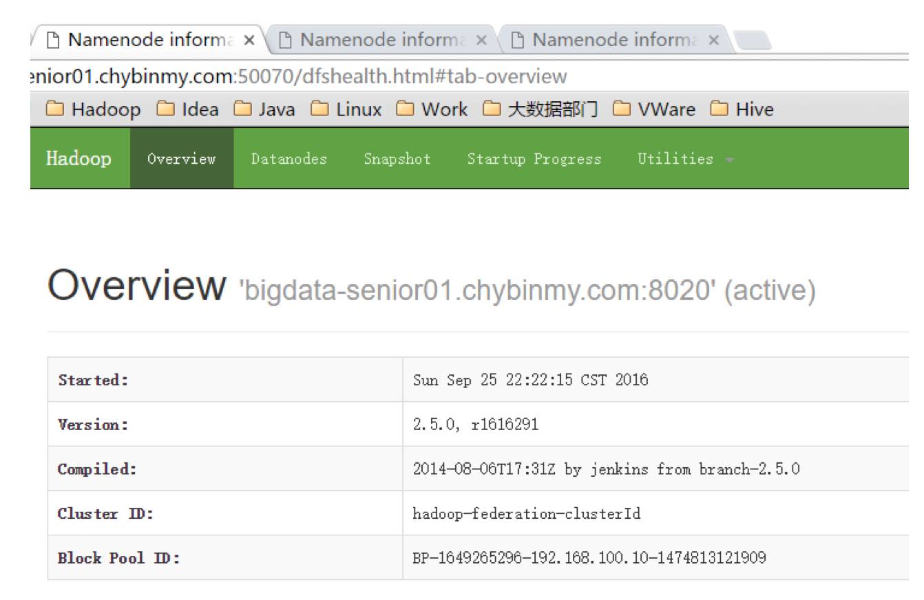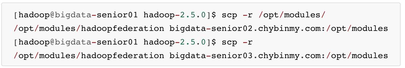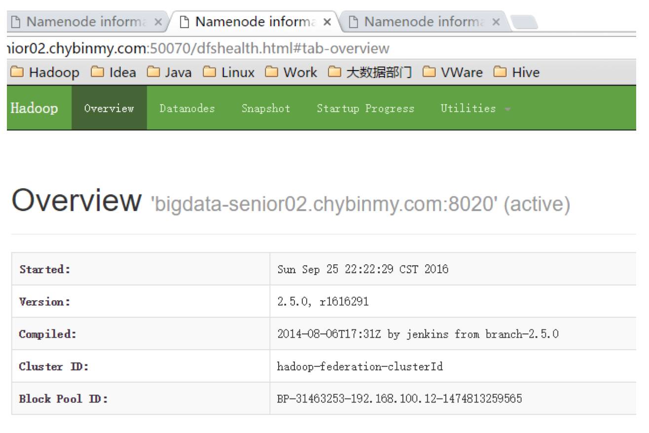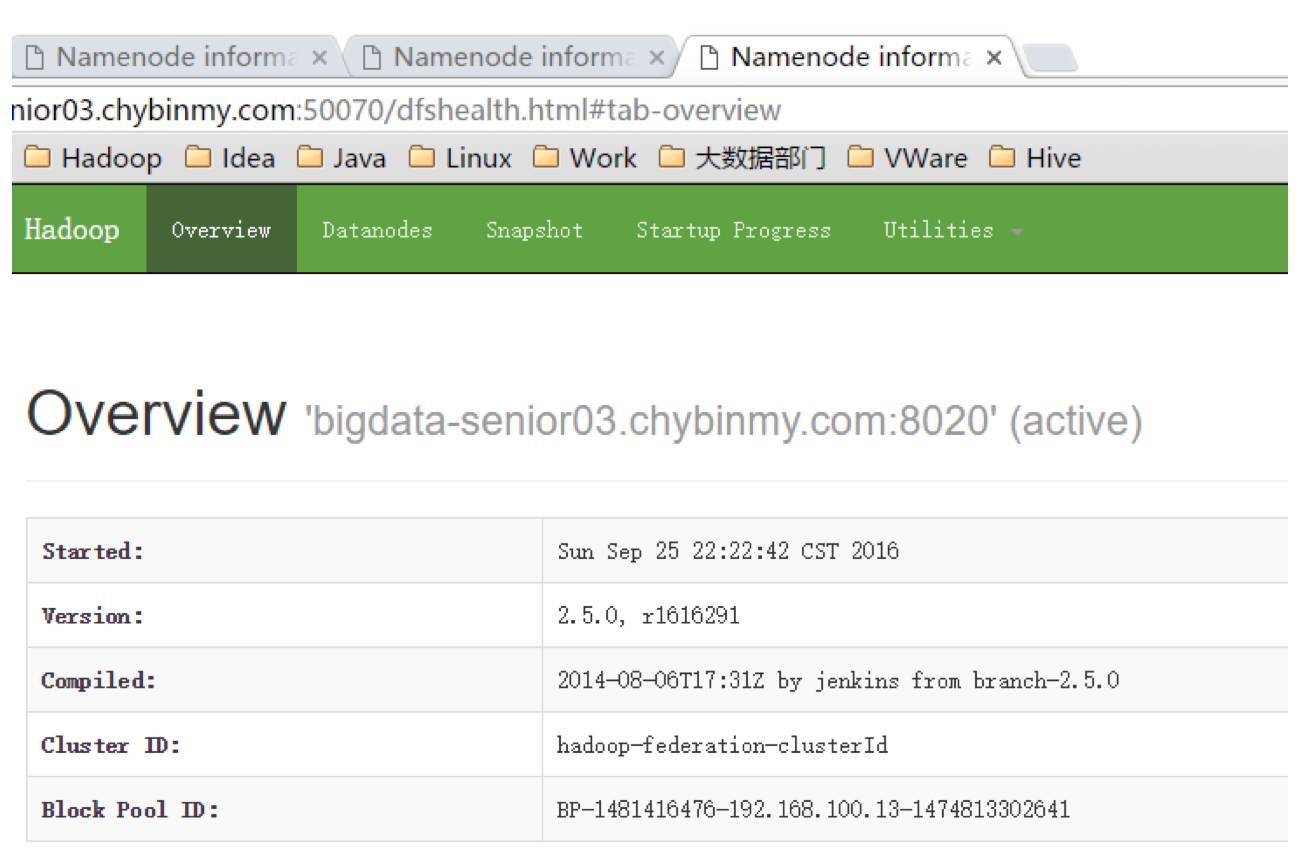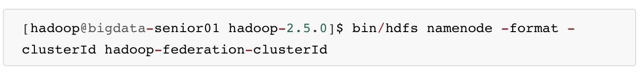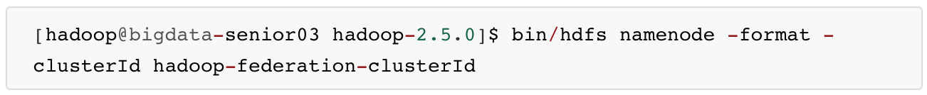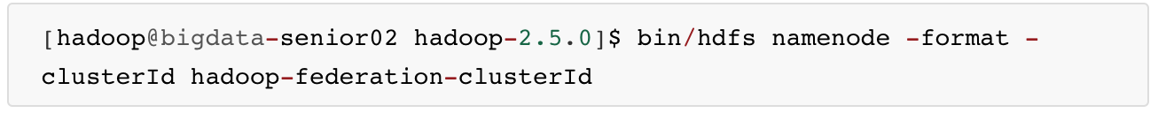 这里一定要指定一个集群 ID,使得多个 NameNode 的集群 ID 是一样的,因为这三个 NameNode 在同一个集群中,这里集群 ID 为 hadoop-federation-clusterId。