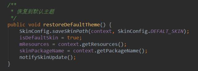 这个方法就是恢复到系统的默认主题,原理和load都差不多,实现还简单了很多。SkinManager这个类就说这么多,详细实现请到源码中去查看,很多地方我都给了注释。