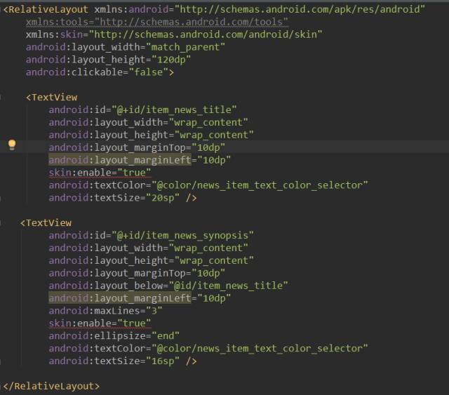 其中xmlns:skin="http://schemas.android.com/android/skin"是我们自定义的,在SkinConfig有。 我们只需在有皮肤更改需求的View中加入skin:enable="true" 就OK了。