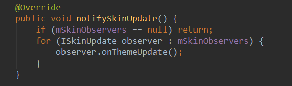 这里很简单,就是去遍历mSkinObservers这个集合,然后去通知更新。对于ISkinUpdate是一个接口,每个需要皮肤更新的Activity都需要去实现这个接口。
