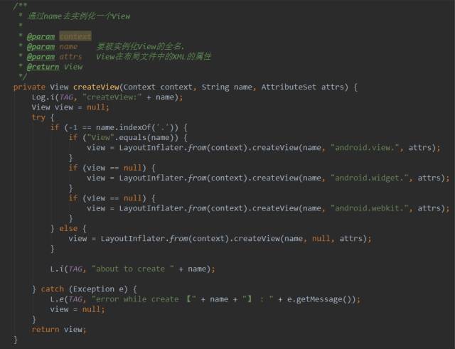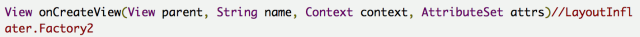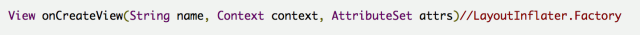 对于LayoutInflater大家可能都不太陌生,当你需要把xml文件转化成对应View的时候就必须用到它,我想对于他怎么使用的就不用我介绍了。LayoutInflater 提供了setFactory(LayoutInflater.Factory factory)和setFactory2(LayoutInflater.Factory2 factory)两个方法可以让你去自定义布局的填充(有点类似于过滤器,我们在填充这个View之前可以做一些额外的事,但不完全是),Factory2 是在API 11才添加的。他们提供了下面的方法让你去重写。在这里面你完全可以自己去定义去创建你所想要的View,如果在你在重写的方法中返回null的话,就会以系统默认的方式去创建View。