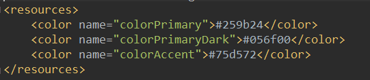 在使用的时候一定要记得要Activity要去继承于SkinBaseActivity,Fragment要继承于SkinBaseFragment,Application要继承于SkinBaseApplication。当然把这个框架做为你的项目依赖项肯定是必不可少的。为了Demo的简单,这里我只使用了下面三个颜色作为可以换肤的资源,当然如果你想要使用drawable文件也是可以办到的,前提是你一定要把这个Demo看懂。