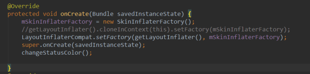 在这里使用了我们之前自定义的View的InflaterFactory,来替换默认的Factory。记住一定要在super.onCreate(savedInstanceState);这个方法之前调用。SkinBaseActivity里面还提供了动态添加可以响应皮肤更改需求的View的相关方法。当然需要响应换肤更改的Activity都需要继承SkinBaseActivity。详细实现请看源码。