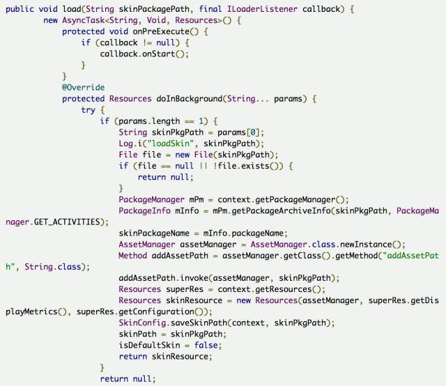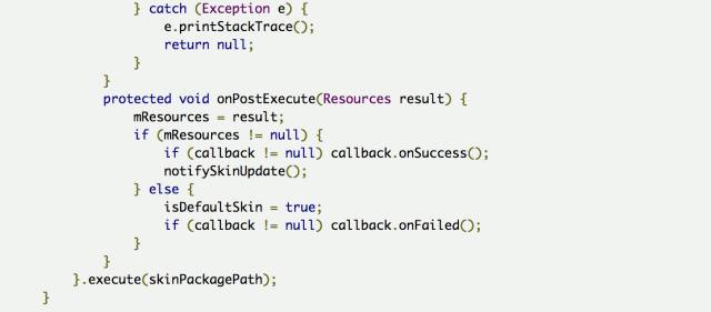 其中doInBackground方法里面就实现了动态的去获取皮肤包的Resources,当获取成功之后,在onPostExecute方法中就将这个Resources赋值到我们定义好的变量中去,以方便我们之后的使用,注意到当获取到的这个Resources不为空时,也就是我们已经获取到了皮肤包里面的资源,我们就调用notifySkinUpdate()这个方法来通知界面去更改皮肤,如果为空就还是使用默认的皮肤。