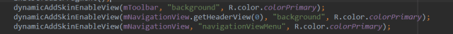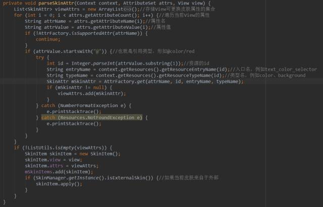 这个方法其实就是去搜集View中换肤的时候可以更改的属性,当我们换肤的时候就是去更改的这些属性的值,这里你必须要注意一点,这个属性的值一定要是引用类型的(例如:@color/red),千万不能写死,第二个if的判断就是这个作用。到这里可能你就会有个疑问,我怎么知道哪些属性在换肤的时候需要更改。如果你细心一点肯定注意到了这行代码