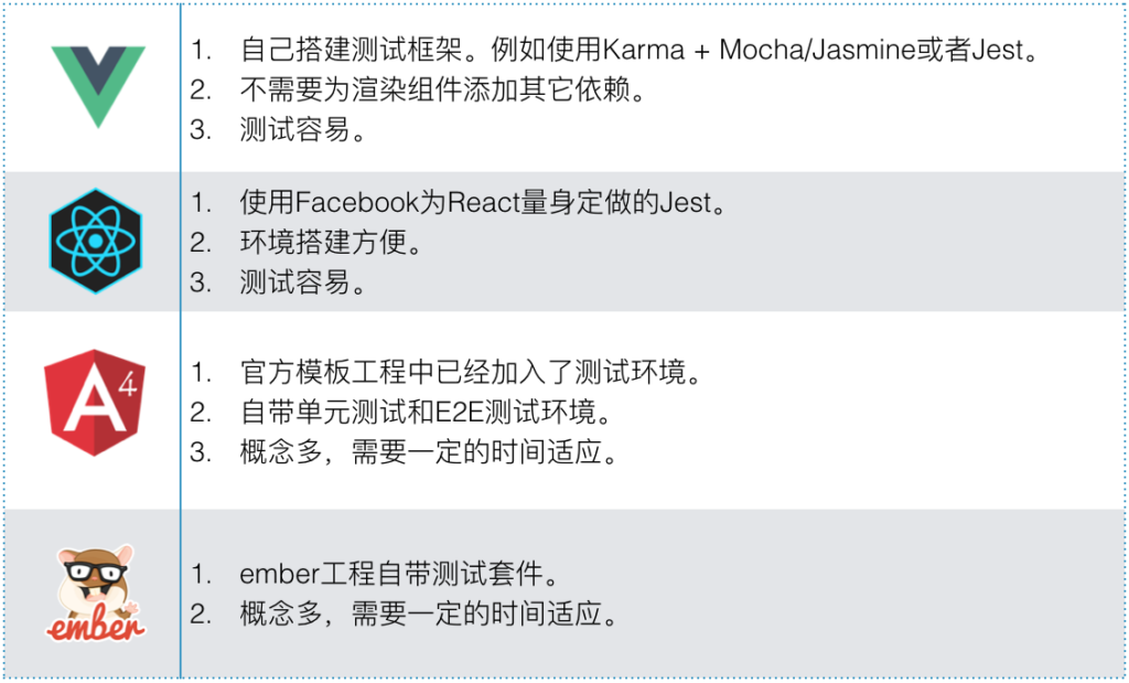 可见,Vue, React测试灵活,可以根据项目具体情况来定制,但是没有统一的测试实践规范,对开发人员的能力有较大依赖。Angular4和Ember概念多,有官方推荐的实践,要完全掌握难度大,优势是实现起来更规范。
