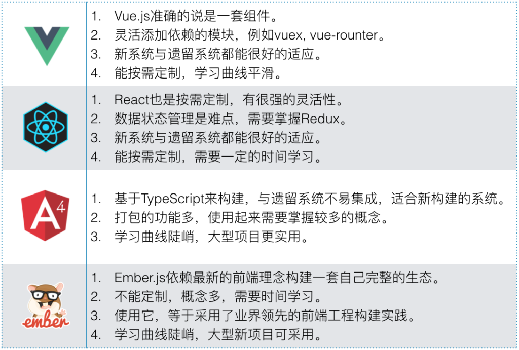 相对来说,Angular4和Ember是大而全的框架,它们更侧重于大型前端工程的构建,为开发人员屏蔽项目构建底层的细节,提出了自己的一套解决方案。使用它们的难点是要度过前期曲线陡峭的学习期,优点是由于使用了标准化的开发方式,后期能极大的提高开发生产力,提升开发效率。