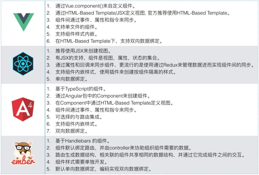 概括起来,就是Vue、Component的组件相对灵活、轻量,添加依赖就可以无缝集成到遗留系统中。对于从0到1的系统,也可以使用新的实践来构建工程,例如ES6、Webpack等技术。Angular4官方推荐使用TypeScript,这需要单独构建和打包,不方便与遗留系统集成。Ember.js自定义了一整套生态,基于CoC理念的设计,采用了前端工程中比较前沿的实践和标准,很难与遗留系统集成,更适合在新项目中使用。至于数据绑定,各有优势。双向绑定在表单交互多的场景中更便捷,单向绑定在管理跟踪记录组件状态时更高效。组件状态更新,各有不同的实现: