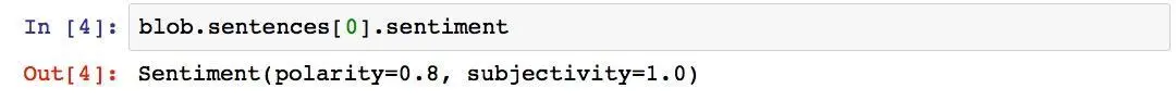 情感极性0.8,主观性1.0。说明一下,情感极性的变化范围是[-1, 1],-1代表完全负面,1代表完全正面。