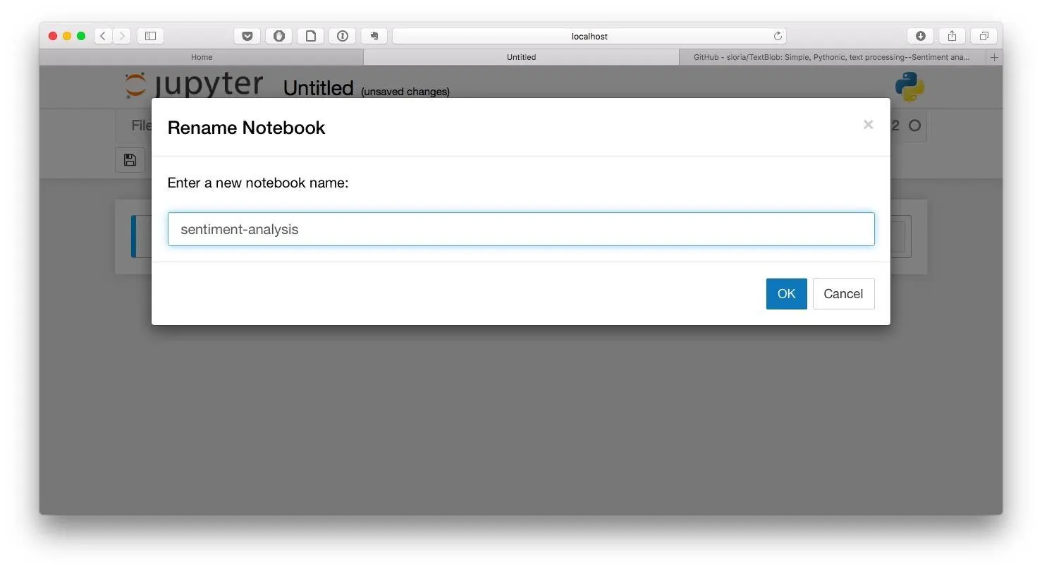 我们新建一个Python 2笔记本,并且将其命名为“sentiment-analysis”。