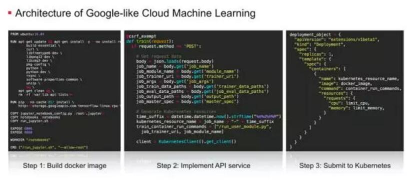 最后,需要实现机器学习场景下的 API 服务。针对机器学习的模型开发、模型训练和模型服务三个主要流程,我们可以定义提交训练任务、创建开发环境、启动模型服务、提交离线预测任务等 API,用熟悉的编程语言来实现 Web service 接口。要实现一个 Google-like 的云深度学习平台,大家可以参考下面这三个步骤。