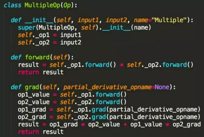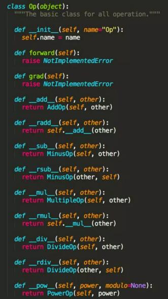那么用户可以定义的最小操作,也就是 Op,需要平台实现基本的算子,例如 ConstantOp、AddOp、MultipleOp 等,而且用户实现自定义算子时可以加入自动求导的流程中,并不影响框架本身的训练流程。参考 TensorFlow 的 Python 源码,下面我们定义了 Op 的基类,所有的 Op 都应该实现 forward() 和 grad() 以便于模型训练时自动求导,而且通过重载 Python 操作符可以为开发者提供更便利的使用接口。