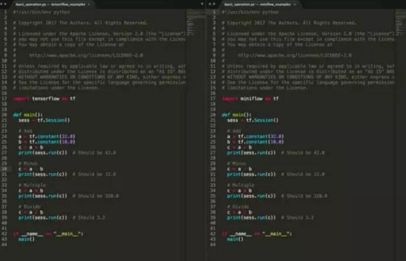 这个项目就是 MiniFlow,一个实现了链式法则、自动求导、支持命令式编程和声明式编程的数值计算库,并且兼容 TensorFlow Python API。感兴趣可以在这个地址参与开发,下面是两者 API 对比图。