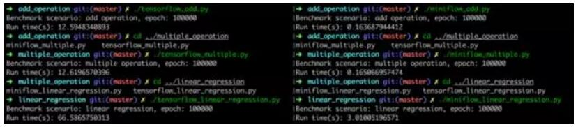 事实上,我个人在学习 TensorFlow 过程中,通过实现一个 TensorFlow-like 的项目,不仅惊叹与其源码和接口的设计精巧,也加深了对声明式编程、DAG 实现、自动求偏导、反向传播等概念的理解。甚至在 Benchmark 测试中发现,纯 Python 实现的项目在线性回归模型训练中比 TensorFlow 快 22 倍,当然这是在特定场景下压测得到的结果,主要原因是 TensorFlow 中存在 Python 与 C++ 跨语言的切换开销。